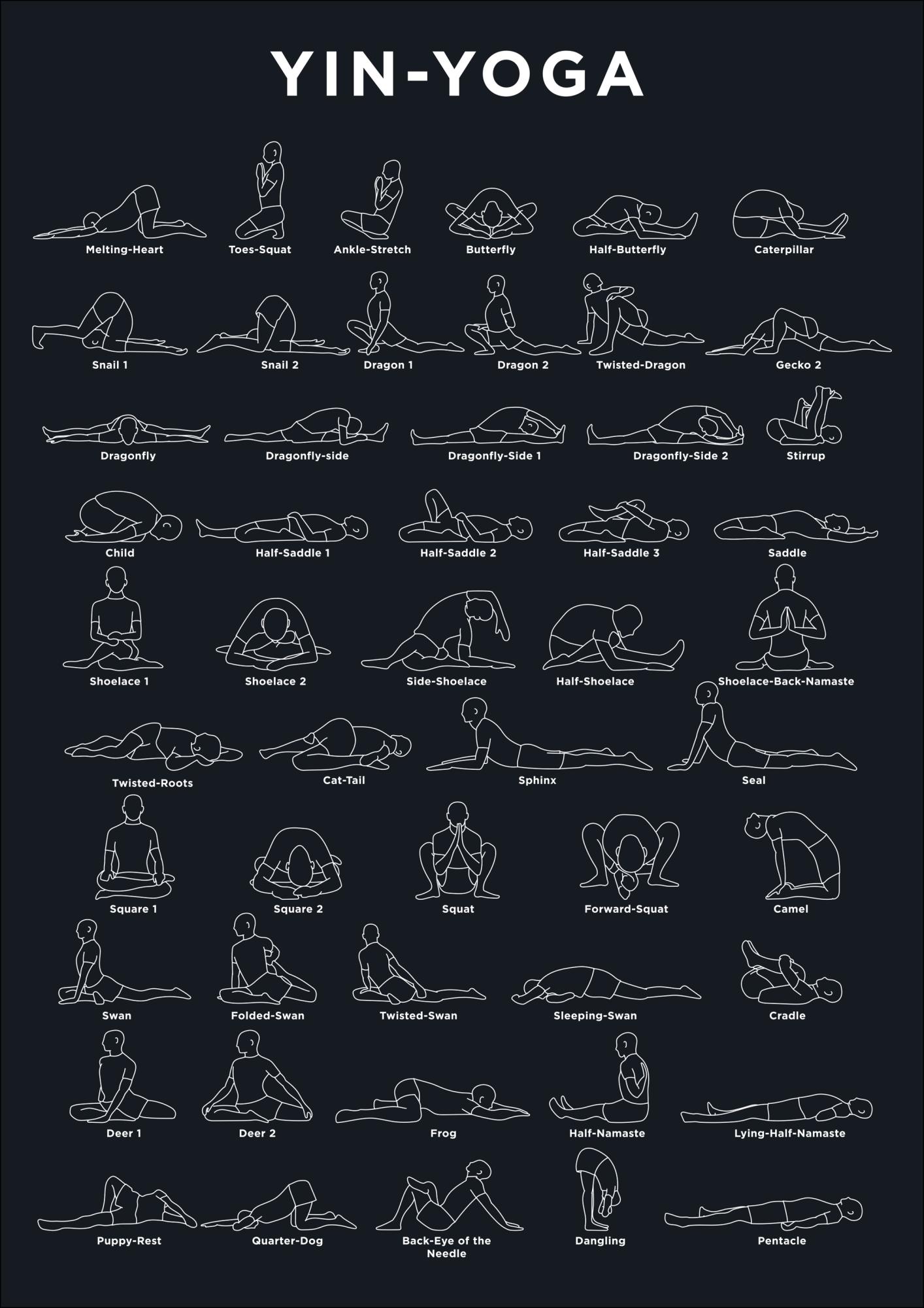 Um póster útil com as diferentes posições de yoga disponíveis. Figuras brancas são desenhadas nas diferentes posições num fundo azul-marinho simples, com o nome da posição escrito abaixo. Prepare-se para se esticar ao máximo quando pendurar isso na parede para se motivar.