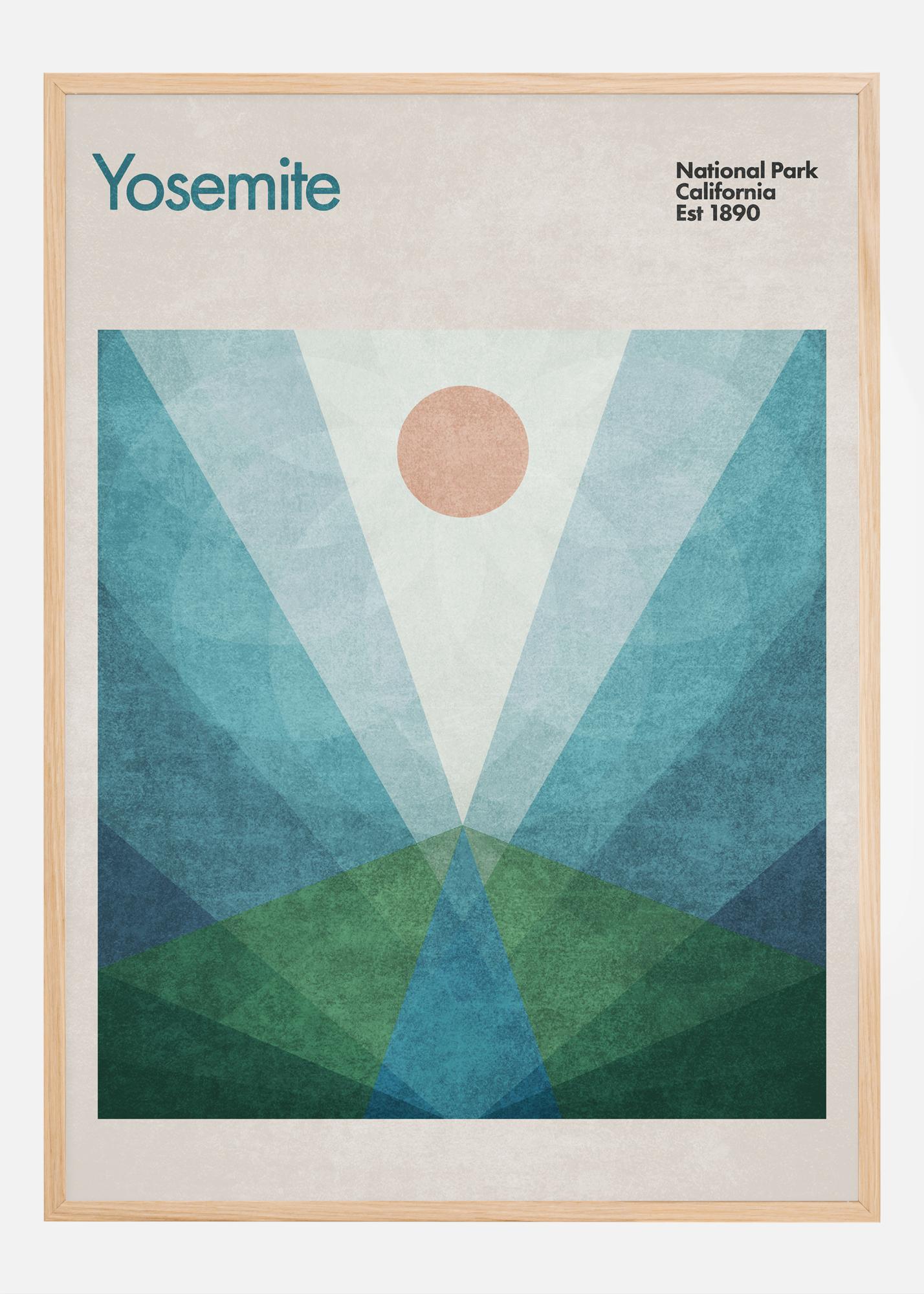 Este cartaz captura o espírito do Parque Nacional de Yosemite com um design geométrico que reflete as paisagens majestosas e icônicas do parque. Com uma paleta de cores que lembra céus claros e vales exuberantes, o texto "Yosemite National Park California Est 1890" homenageia a longa história do parque como um parque nacional e um tesouro natural.