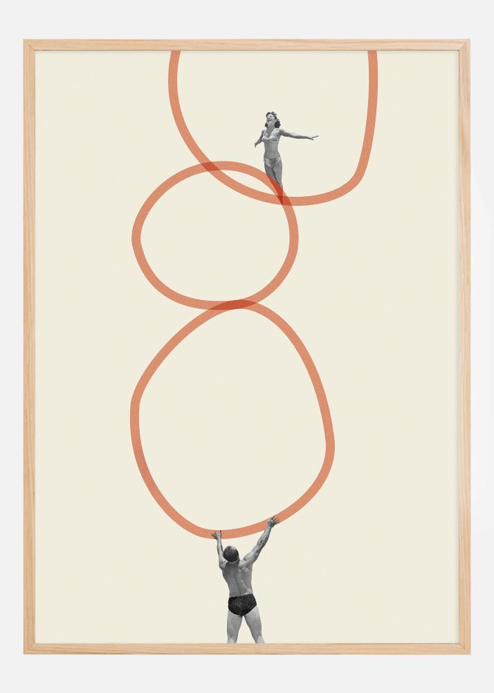 Este cartaz único apresenta uma composição que se assemelha a uma dança de contornos e interação humana. A imagem mostra uma pessoa em um movimento fluido, equilibrada por outra figura em pé, forte e firme no chão, ambas emolduradas por círculos flutuantes de cor terracota-vermelha que criam uma sensação de movimento e continuidade.