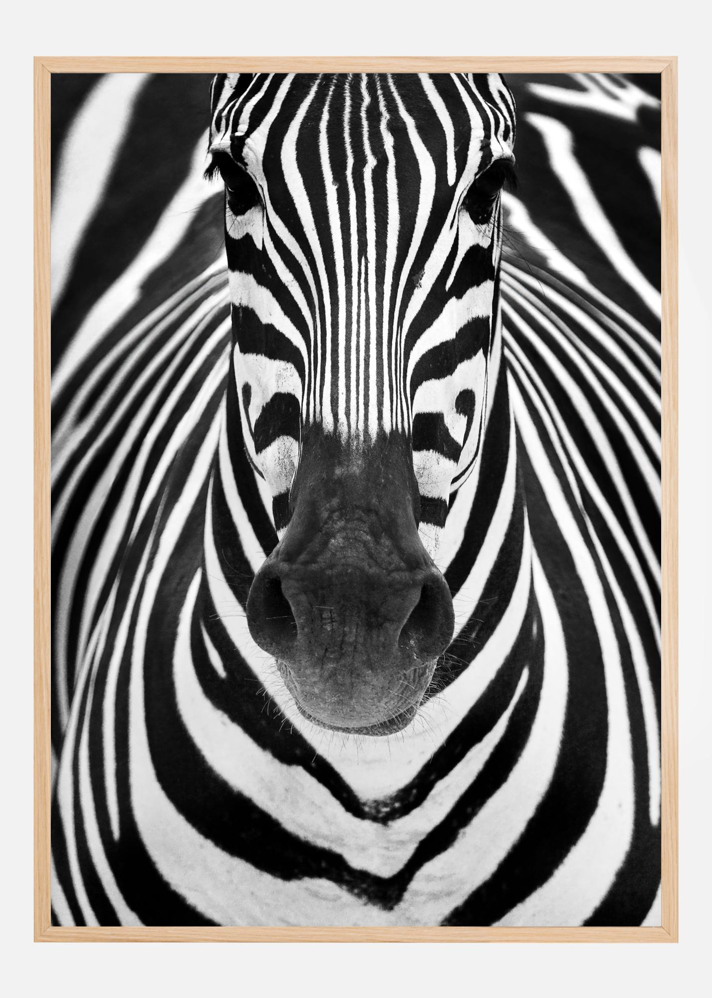 Um póster animal fantástico com uma zebra virada para a câmera. Adicione algumas formas fortes em sua casa e combine este póster impressionante com uma parede colorida para uma verdadeira sensação de arte abstrata.