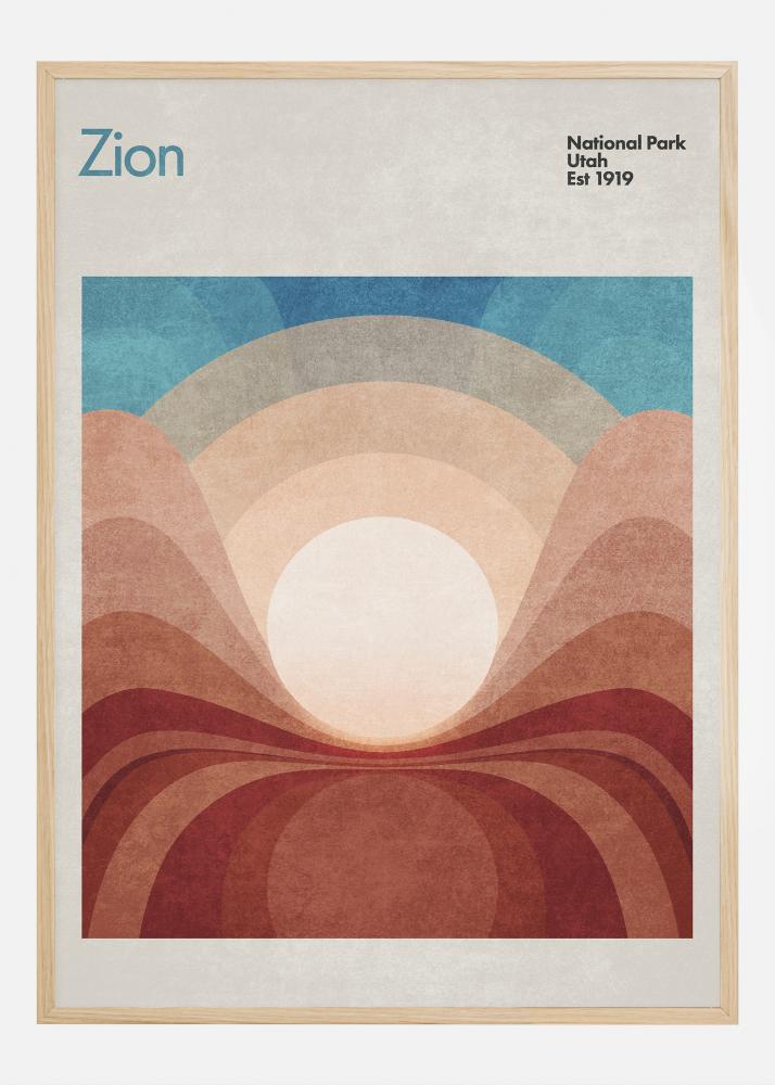 Este pôster captura a grandiosidade da natureza no Parque Nacional de Zion com camadas estilizadas de paisagens que criam uma interpretação abstrata das icônicas formações rochosas do parque e das vistas amplas. O texto "Parque Nacional de Zion Utah Est 1919" fornece um contexto histórico e homenageia o legado do parque como um tesouro nacional desde o início do século XX.