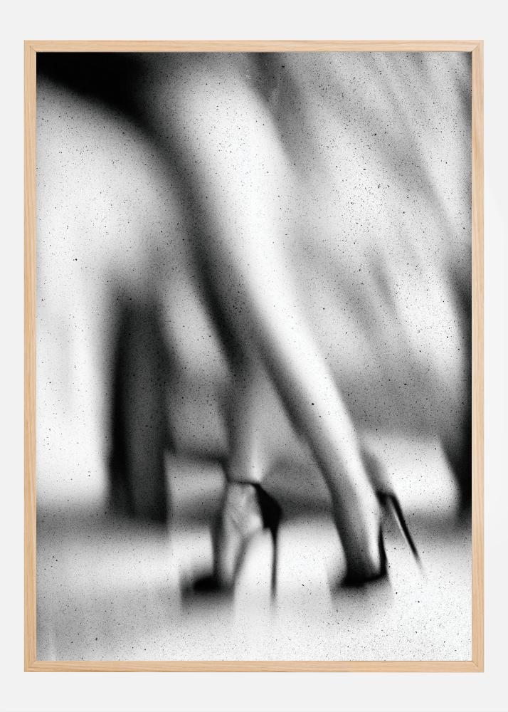 Este pôster artístico brinca com desfoque e contraste para criar uma sensação de movimento e abstração. Retrata um par de pernas em sapatos de salto alto em uma atmosfera quase borrada em movimento, o que confere à obra uma sensação etérea e dinâmica. A escala de cores monocromáticas do pôster evoca uma sensação de intemporalidade e modernidade.